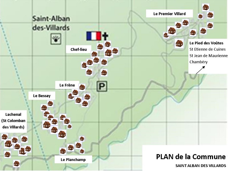 La commune de Saint-Alban-des-Villards est composée de plusieurs hameaux, à commencer par celui du Pied des Voûtes, limitrophe de la commune de Saint-Etienne-de-Cuines, puis le Premier Villard, le Chef-lieu (l'Eglise et le Mollard), le Frêne, le Bessay et le Planchamp.